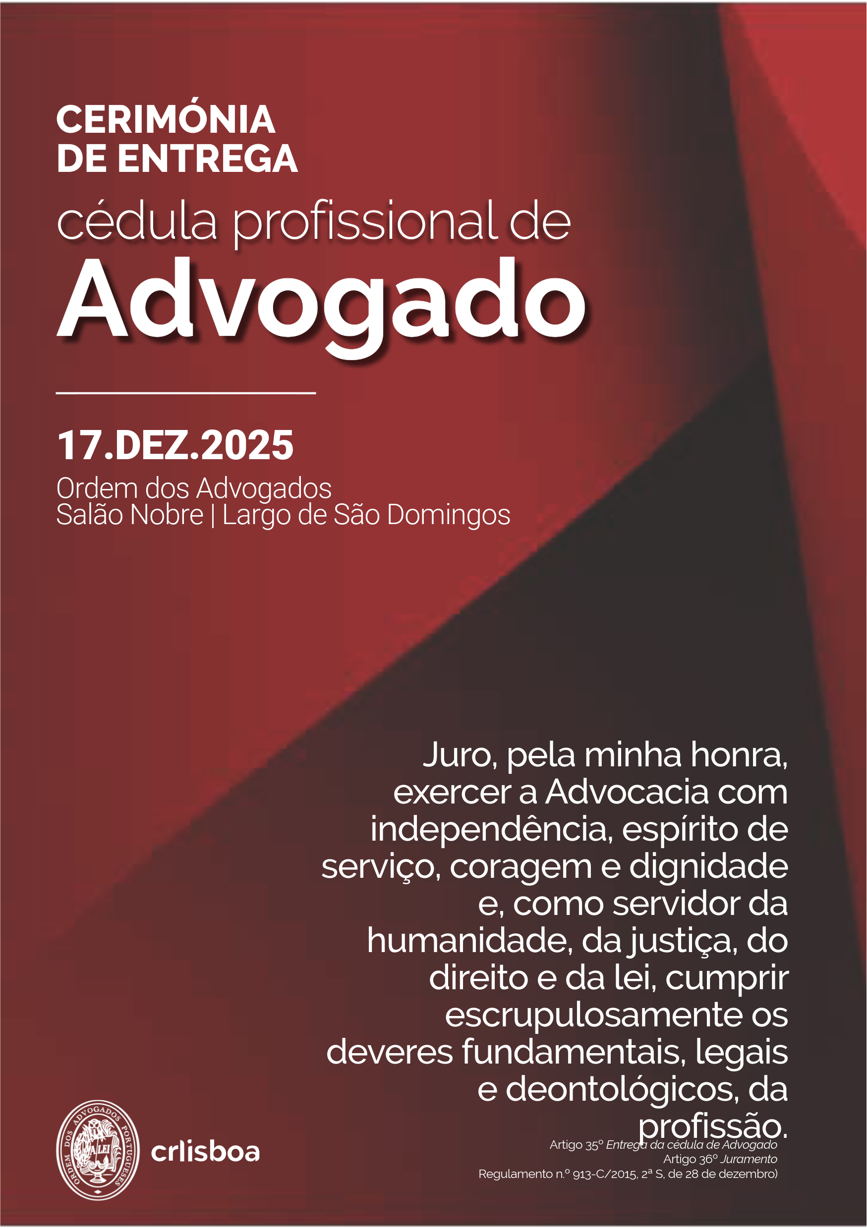 No dia 17 de dezembro de 2025, no Salão Nobre da sede da Ordem dos Advogados, realizou-se uma cerimónia pública de juramento e entrega da cédula profissional de Advogado/a, com a presença do Bastonário, Dr. João Massano, que presidiu à cerimónia, e do Presidente do Conselho Regional de Lisboa, Dr. Telmo Guerreiro Semião.